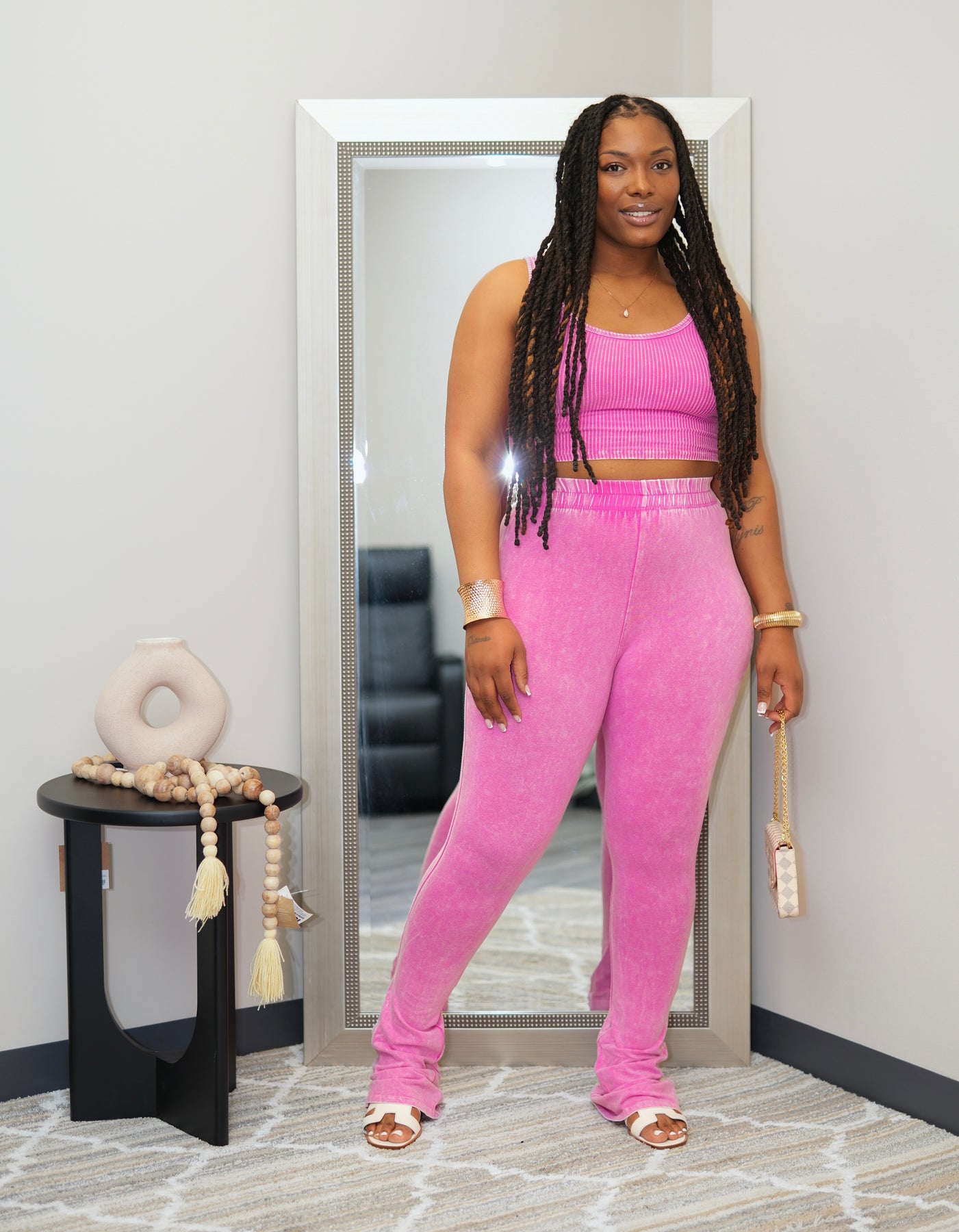 Mineral wash two piece set, crop rib tank with tall girl friendly flare bottoms.